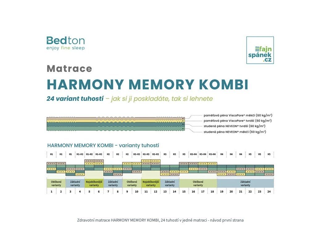 V tabulce je vidět, že nejoblíbenější varianty jsou čtyři (č. 5/6/11/12), které počítají s tím, že v horní části jsou obě vrstvy paměťové pěny. Dále je zde osm oblíbených variant (č. 1/2/9/10/15/16/17/18), které počítají s tím, že v horní kontaktní ploše je použitá alespoň jedna z paměťových pěn. Některé tyto oblíbené varianty umožňují vytvořit tzv. otočnou matraci s paměťovou pěnou z každé strany (č. 2/10/15/18). Jednoduchým rychlým otočením matrace si může uživatel vybrat z tužší nebo měkčí strany s paměťovou pěnou v kontaktní ploše. A pak je zde dvanáctzákladních variant (č. 3/4/7/8/13/14/19/20/21/22/23/24), u kterých je počítáno s tím, že uživatel leží “jen” na HR studené pěně. I tyto varianty patří mezi oněch 24 tuhostí, protože se běžně vyrábějí matrace pouze ze studené pěny. I varianta poskládaná tak, že kontaktní plochou je studená pěna, může dobře posloužit například v období vysokých veder. Citlivější uživatel na teplo, si přeskládáním na studenou pěnu sice pohorší v tvarování matrace, ale zároveň si tím může ulevit od reakce paměťové pěny na zvýšení komfortní teploty. Takže by bylo mylné tyto varianty mezi 24 tuhostí nepočítat.