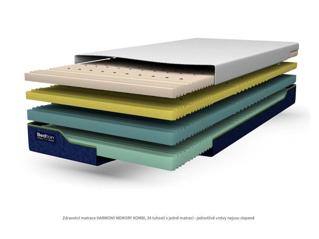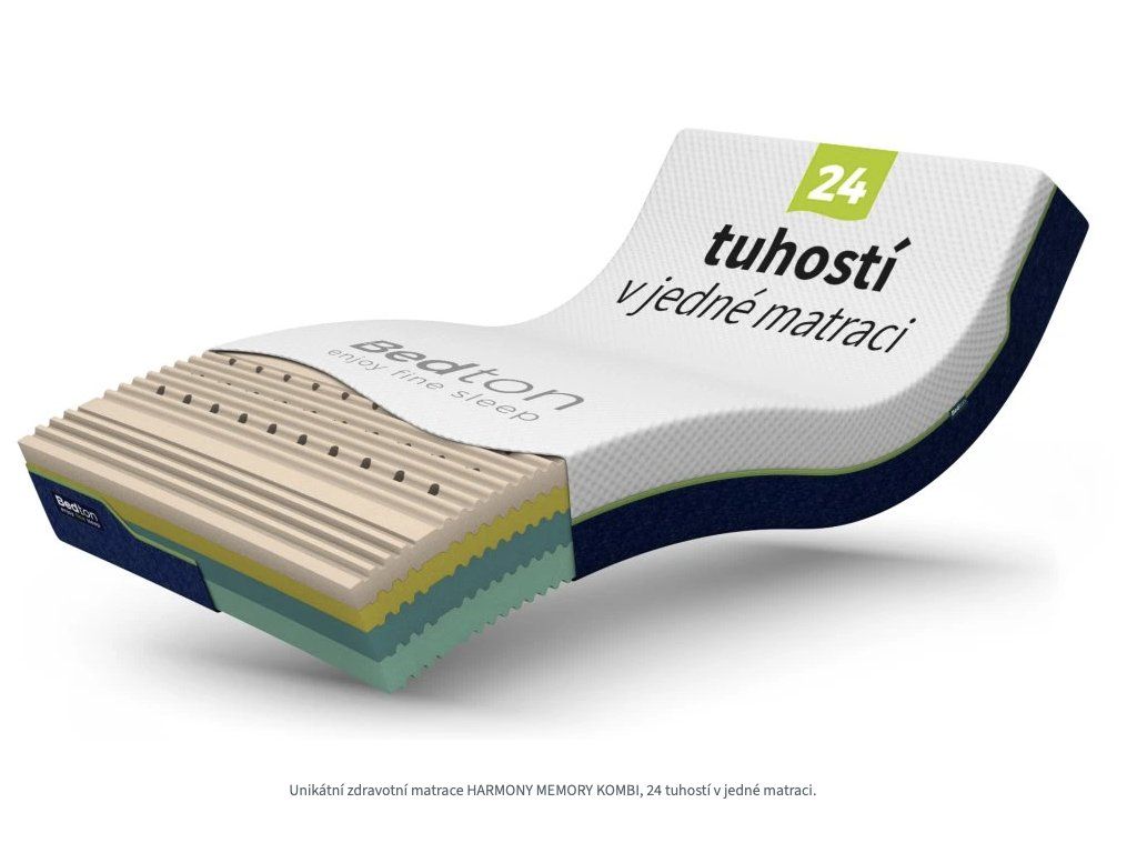 Matrace HARMONY MEMORY KOMBI s unikátní paměťovou pěnou ViscoPore® Klima, která zabraňuje hromadění tepla, je oboustranný sendvičový typ matrace s možností individuálního nastavení až 24 tuhostí.