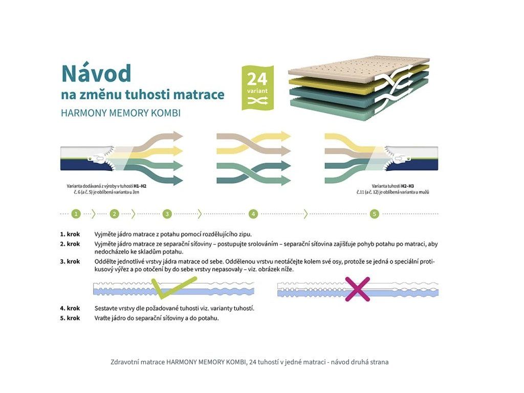 Matrace nabízí obrovský výběr z 24 tuhostí od H1 (velmi měkká) až po H5 (velmi tuhá). Změny tuhosti lze dosáhnout přeskládáním jádra matrace. Podrobný návod na změnu tuhosti je ke stažení v dolní části v záložce KE STAŽENÍ.