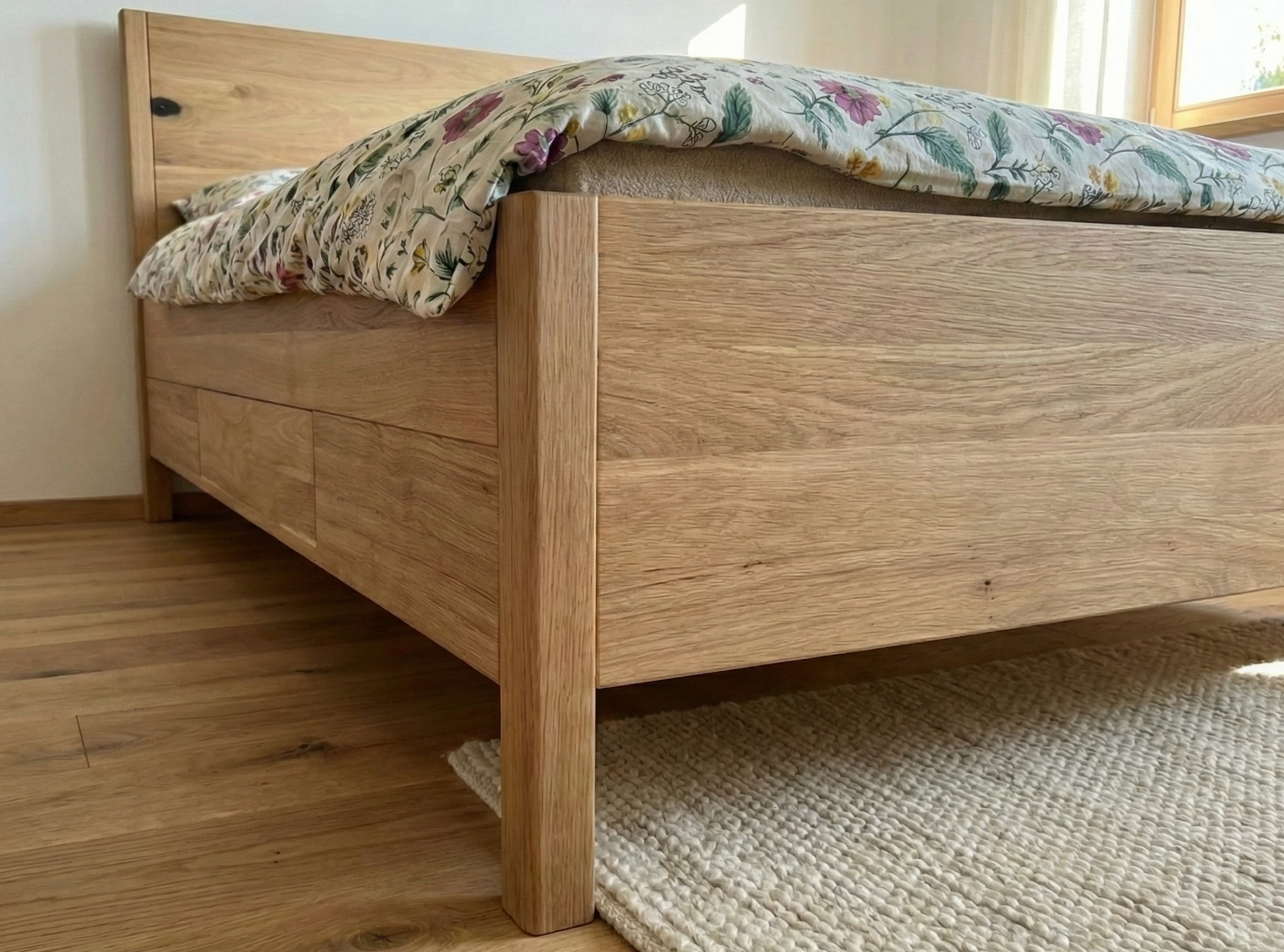 Elegantní postel z masivního dubu s praktickým úložným prostorem. Čtyři prostorné šuplíky s tichým dojezdem a otevíráním push-to-open poskytují dostatek místa pro uložení lůžkovin či oblečení. Díky možnosti LED podsvícení působí moderně a zároveň zajišťuje pohodlný pohyb v ložnici i během noci.